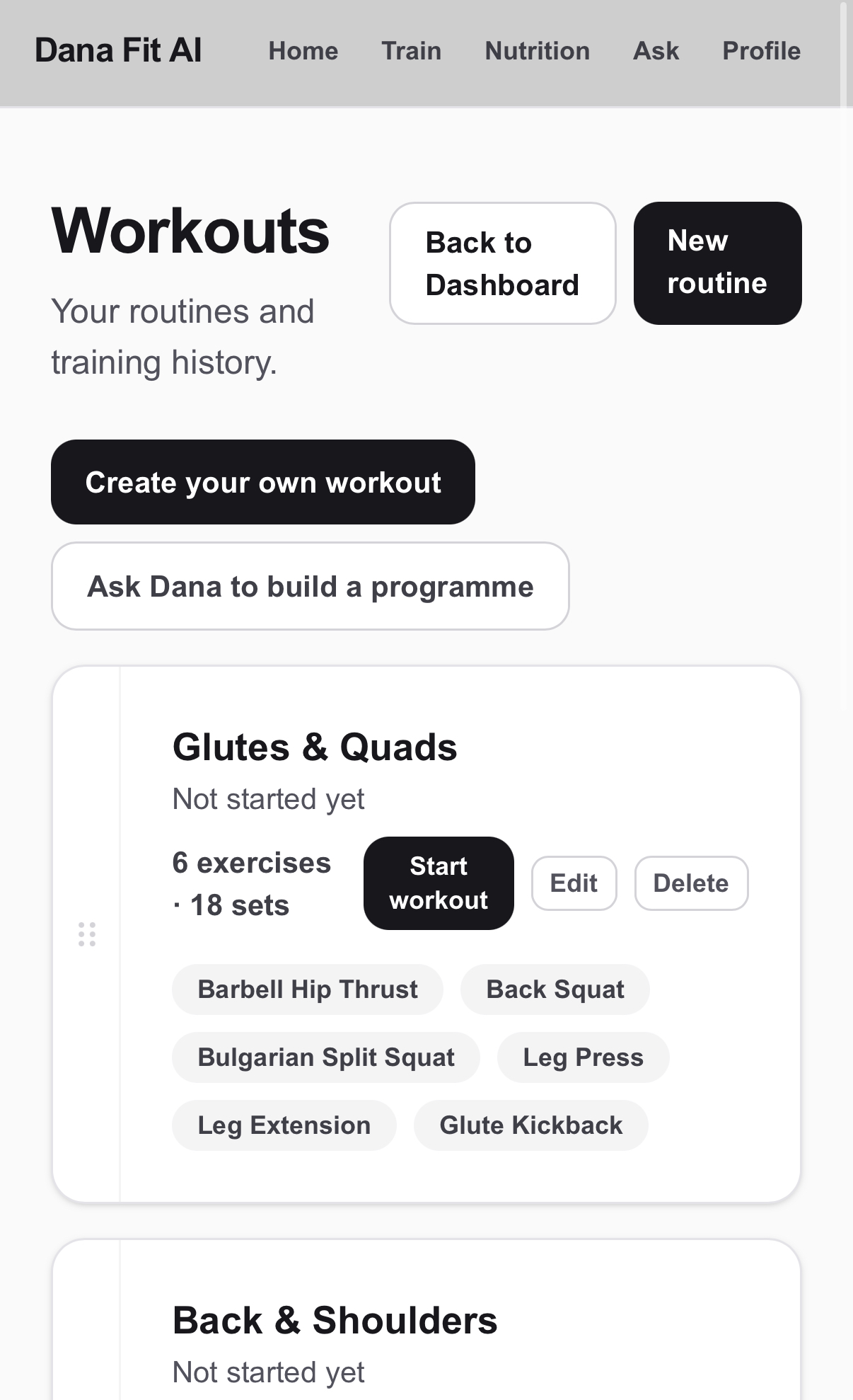 Dana builds a full training programme personalised to you — ready to log immediately. No planning required.